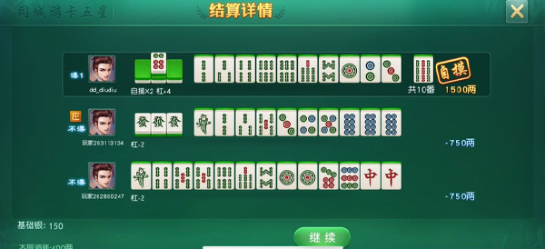 听牌后,满足胡牌牌型的玩家可以选择胡牌。其中,比较特殊的胡牌牌型为卡五星,指的是手上有四筒六筒或四条六条,听牌是一张五筒或者五条,如果胡牌就叫做卡五星。