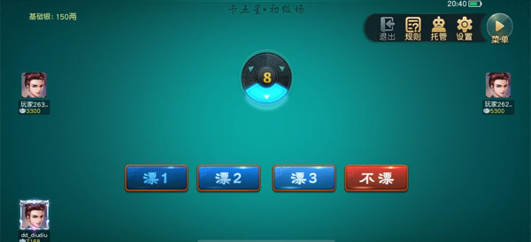 卡五星游戏中,玩家可以选择是否下漂,1倍、2倍或者3倍,也可以选择不漂,在结算时输赢都会加上相应的漂倍数。