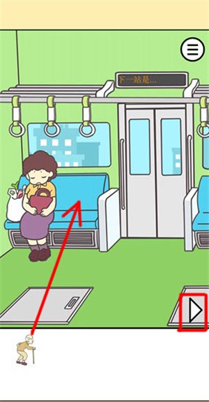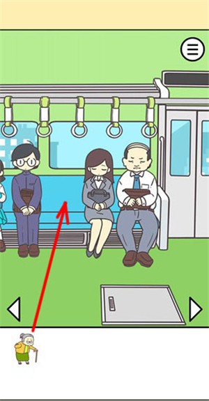 2、按住道具栏中的老爷爷,拖到空座椅上,让他坐着,然后点击右侧按钮,前往车厢最右侧区域。