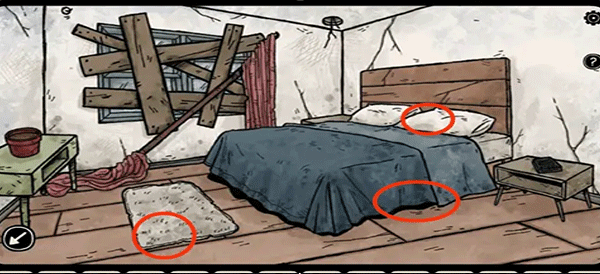 5、切换到巴斯蒂安,拿走床底以及垫子下方的半个面具和鱼钩,在枕头下方找到第二只收集要素。