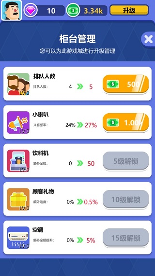 随着时间的推移和金钱的累计,点击柜台可以进行多方面的升级,如增加派对人数、提升光顾店面的唠嗑频率,以及置办饮料机、顾客礼物、空调等其他额外功能,会不同程度的提升营业速度和金币利益哦。