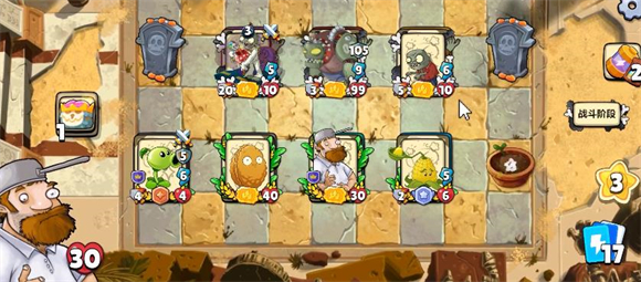 2、开局的话先正常开局,如果抽到三重豌豆直接放中间来做核心输出,后面只要不断给它加攻击并保证它存活就可以了。