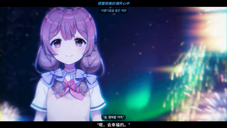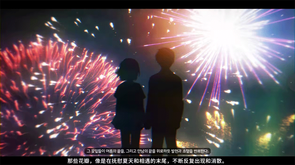 由于经费不足的原因,游戏很少出现静态CG,大部分对话场景的背景与人物不在一个图层上,背景运用了大量AE动态特效,虽然成本低,但是也体现出了一种独特的风格,仿佛整部游戏都是OP的感觉...说到AE,等暑假到来准备学学,pr的特效还是过于有限,羡慕会用AE的人...
