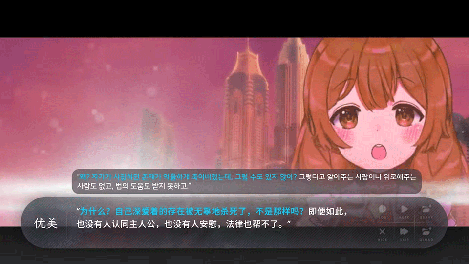 整体采用了大量意识流写法,很多剧情用抽象的语言来描述,很佩服作者的文笔……游戏在2021年发行,当时的作者是一名韩国高中生,组了一个四人小团队去完成这部游戏,作为高中生能写出这样的文字,不得不佩服...不过整体剧情也是有明显问题,很多坑到最后才被填满,前期留下的悬念太多导致剧情容易接不上一起,导致前期的游玩过程会略显枯燥。