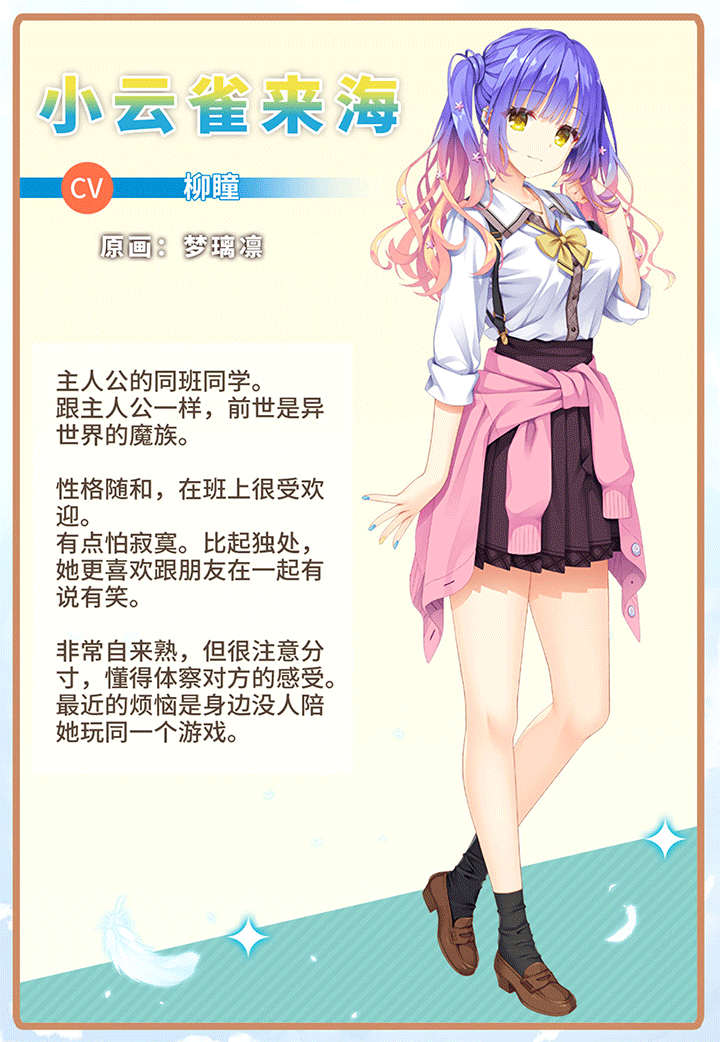 小云雀来海性格开朗热情,喜欢社交与分享,多参与她组织的活动,积极回应她的话题,在她需要陪伴时及时出现,能让她对你产生好感。在与她的互动中,展现出积极乐观、幽默风趣的一面,更能吸引她。