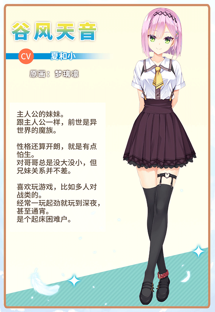 天音性格活泼,热爱游戏,和她一起玩游戏,或是在她游戏遇到困难时提供帮助,能加深感情。同时,作为妹妹,她对哥哥有深厚的依赖,在日常互动中展现出兄长的关怀,会让她的好感度稳步提升。