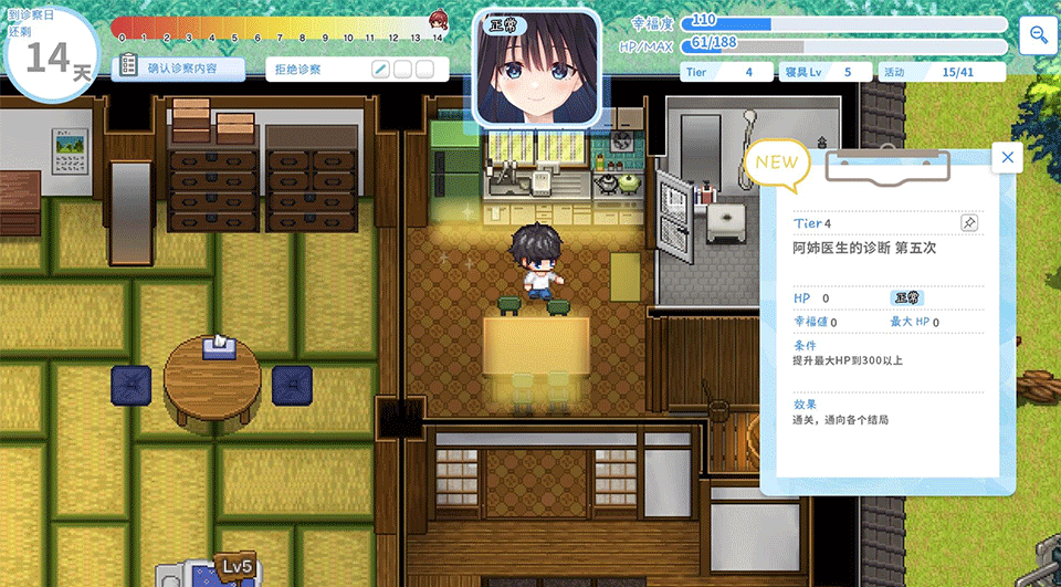 2、整体逻辑是在规定时间内提升妹妹的最大HP,完成规定事件以通过医生的检查。
