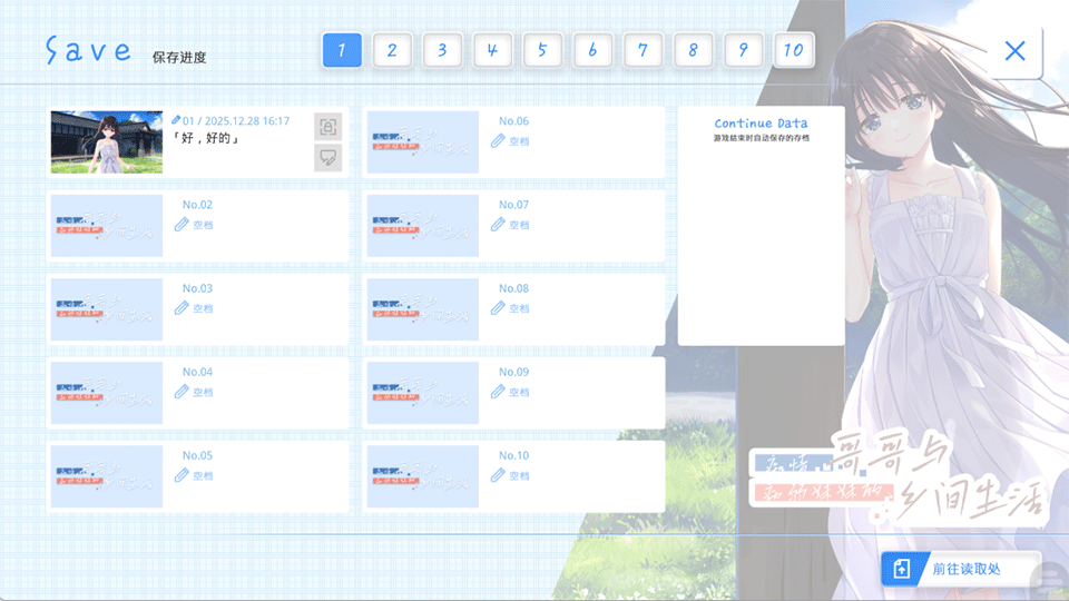 5、存档界面支持10个存档位,可通过存档位切换不同游玩进度,【前往读取处】可快速跳转到读档界面。