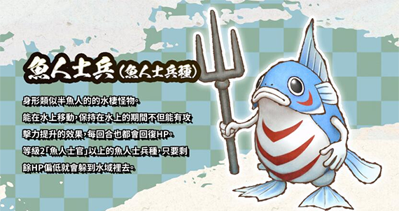 身形类似半鱼人的水栖怪物,能在水上移动,保持在水上的期间不但能有攻击力提升的效果,每回合也都会回复HP。等级2“鱼人士官”以上的鱼人士兵种,只要剩余HP偏低就会躲到水域里去。