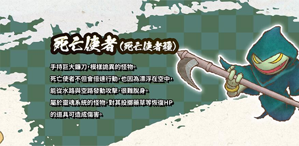 手持巨大镰刀模样诡异的怪物,死亡使者不但会倍速行动也因为漂浮在空中,能从水路与空路发动攻击,很难脱身,属于露魂系统的怪物对其投掷药草等恢复HP的道具可造成伤害。