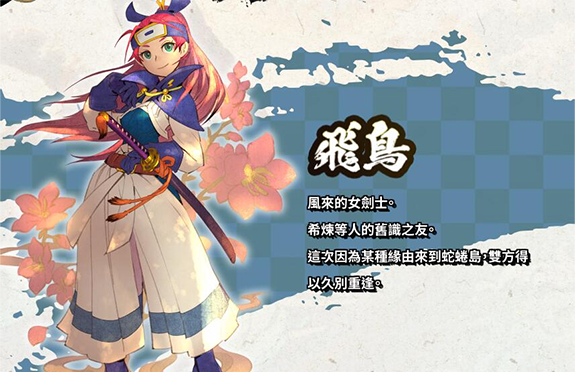 风来的女剑士,希炼等人的旧识之友。这次因为某种缘由来到蛇蜷岛双方得以久别重逢。