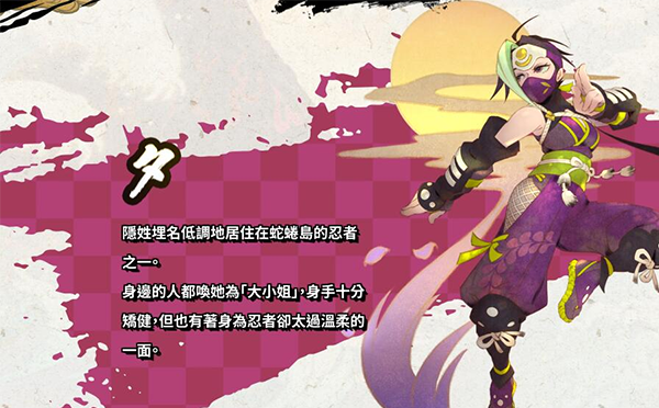 隐姓埋名低调地居住在蛇蜷岛的忍者之一,身边的人都唤她为“大小姐”,身手十分矫健,但也有着身为忍者却太过温柔的一面。