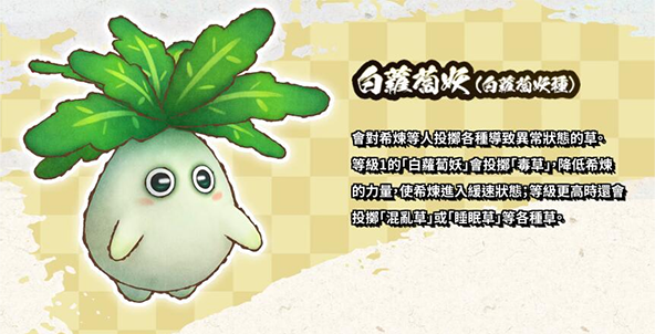 会对希炼等人投掷各种导致异常状态的草,等级1的白萝卜妖会投掷毒草降低希炼的力量,使希炼进入缓速状态,等级更高时还会投掷混乱草或睡眠草等。