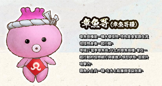 章鱼哥种是一种水栖怪物,特色是会紧跟在其他怪物身后一起行动。等级2“当季章鱼哥”以上的章鱼哥种,会在一起行动的怪物被打倒后进入愤怒状态,并提升攻击力,跟鱼人士兵一样,在水上能获得增益效果。
