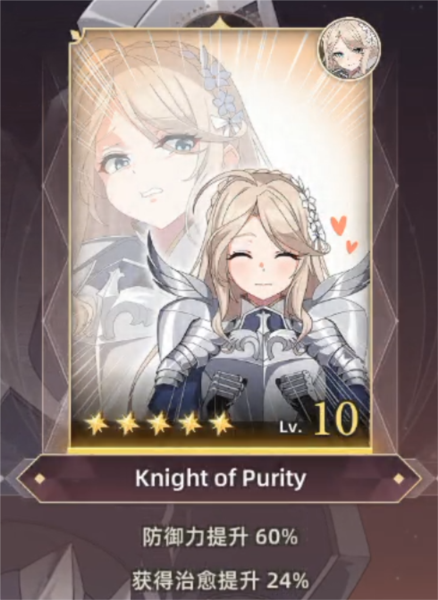 满级卡牌可以提供60%防御力加成和24%获得治愈提升,属性面板还是非常不错的,但是专属卡牌附带的被动技能,虽然可以获得两倍血量的护盾,但是护盾存在期间,治疗是不生效的,护盾量虽然很高,但是因为是一次性的,所以有点拉低了专属卡牌的携带优先级。