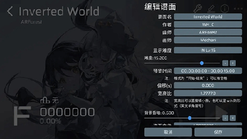 点击铅笔图标,屏幕右边出现谱面设置界面,这里可以调节谱面定数,宽高比和Tip等,请自行调节(记得保存)