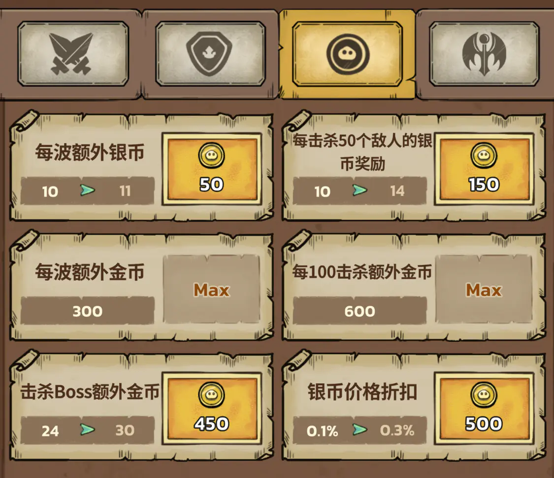 通关第一章之后!你的升级面板里第三个选项(战斗收益)那里应该会提示可以升级金币收益、升级之后就有了 “每波结束后获得额外金币”、“每击杀100敌人奖励金币”和“击败首领获得金币” 的选项。听我的,它们就是中后期最强的“发动机”,优先级直接拉到顶!