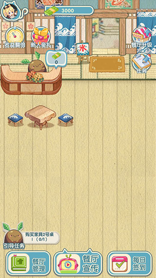 1、进入游戏之后,简易的餐厅只有一张餐桌用来招待顾客。