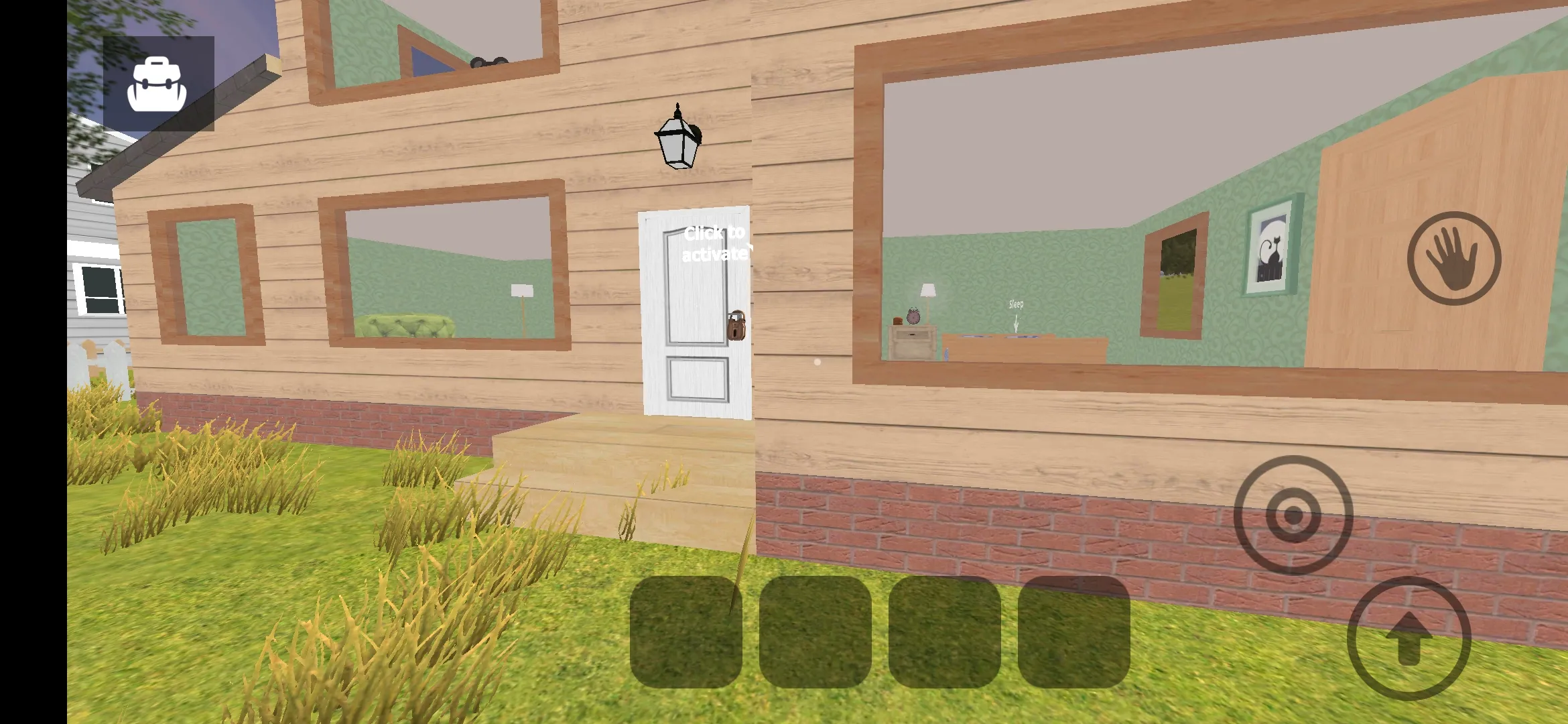 12、我们直接走到门口,小白点对准大门,点击右侧按钮,就可以打开大门,非常轻松,打开大门后可以看到里面小房间内有一个人,他就是我们的邻居了。
