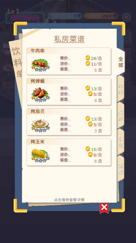 3、食物的属性可以通过升级来进行提升(进价当然是不会提升的[表情_斜眼笑]),提高出售的单价和装盘的数量,可以显著增加店铺的收入哟