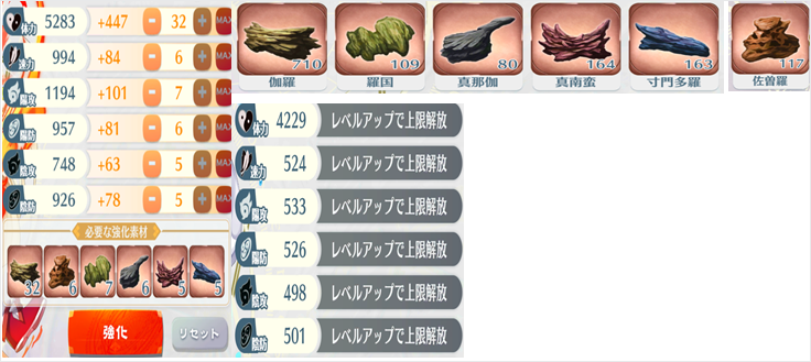 强化绘礼会增加其增加的属性,强化所需材料通过符卡右上角的属性决定,分为梅兰竹菊四种。