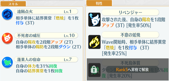 每个角色拥有技能和特性各三个,随着五次昇格开放,即Rank1——5,顺序为:初始即存在的技能1→特性1→技能2→特性2→技能3→特性3
