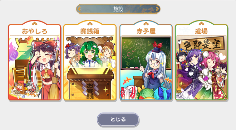 设施分为灵力箱,塞钱箱,寺子屋和道场四种。