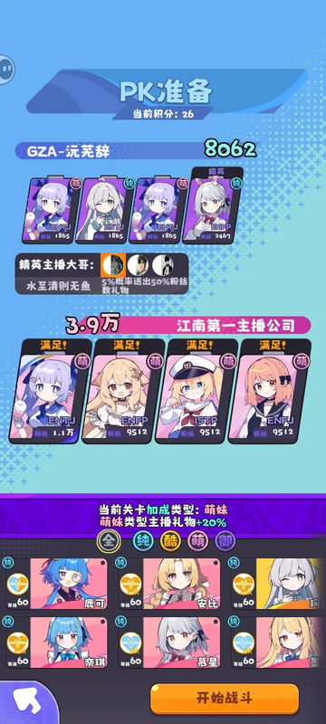 PK玩法:根据主播粉丝数的较量PK,可以通过上阵加成类型更方便通过
