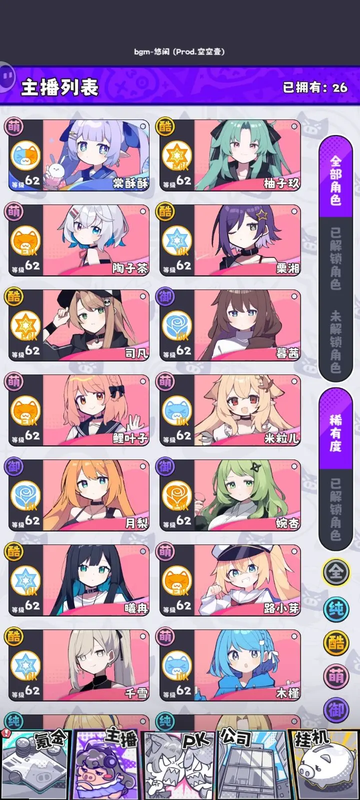 多元主播养成:28名二次元美少女,四大系别、自由升阶,立绘精美、技能各异。