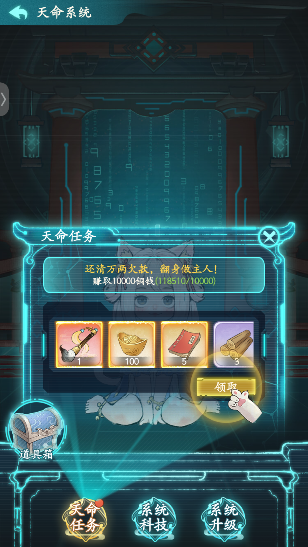 穿越X系统流?车祸救下的小猫竟是天命系统化身!完成系统任务,解锁店铺收益加成等强力外挂buff;养成猫娘从幼年期至成熟体,解锁全新形态与剧情。逆袭之旅上系统助力总能快人一步,让你的经商之路事半功倍。