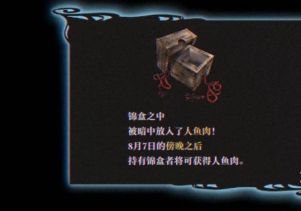 在新的故事线“夺取”里会跟老外二人组交涉, 选择“想要长生不老”———“还请务必通融!”——“老实说出理由”就能获得锦盒,接下来回水口家,人鱼鳞片在神龛下面的柜子里面,把鳞片放到盒子里,这个时候稍微等一下,然后打开对话记录就能看到人鱼戏给的进一步提示。