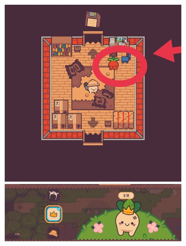 击败野猪后,与守门人对话可获得王冠。