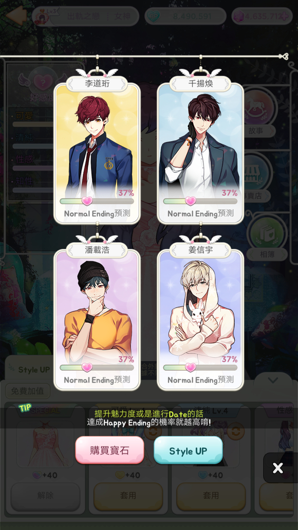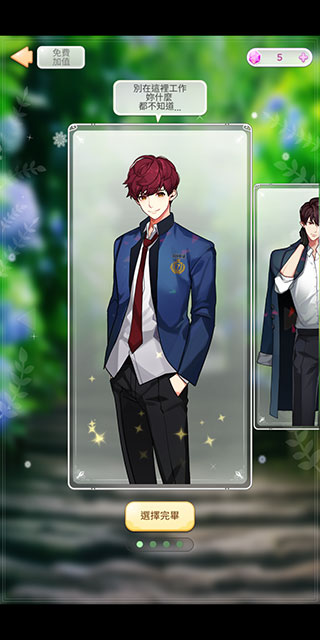 1.玩家可通过界面左上角的“好感度”功能查看与各男主的关系进展,以便预测和调整故事结局。游戏的好感度计算并非简单数值累加,而是采用百分比形式。
