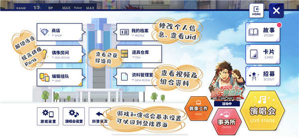 偶像故事:偶像的个人小剧情,每位偶像都有一话初始个人剧情,其他个人故事则需要抽取对应的故事招募并解锁对应的偶像之路开启。