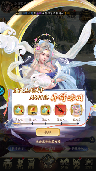 - 持续推进主线至70关,不仅能收获大量仙玉、高级寻仙令等资源,还可免费领取五星嫦娥神将。