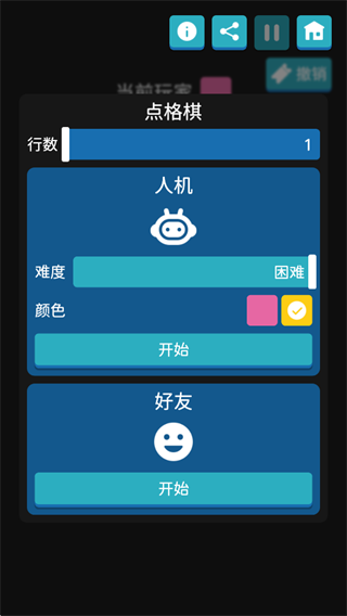 1. 进入“点格棋”玩法,将行数设为1,人机难度选择“困难”,颜色务必选择第二个选项(即后手操作)。