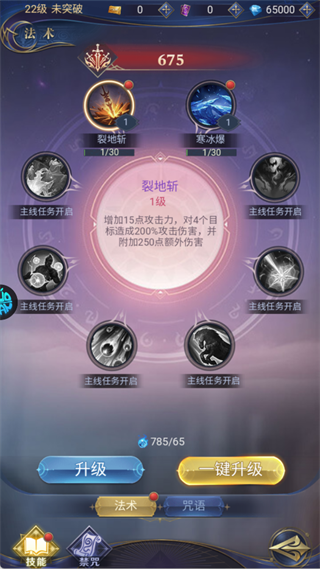 重点升级已解锁的主动技能如「裂地斩」「寒冰爆」,显著提升AOE伤害与清怪效率;合理分配技能点与材料,使用「一键升级」功能最大化技能等级,并随角色成长及时学习新技能。