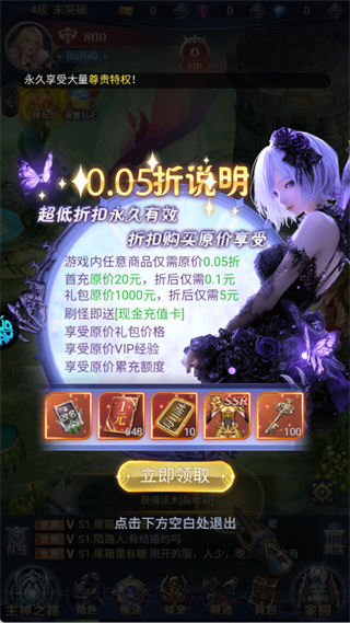 游戏内所有商品永久享受0.05折优惠:首充20元仅需0.1元,千元礼包仅需5元,且仍可获得原价对应的VIP经验与累计充值额度,性价比拉满。