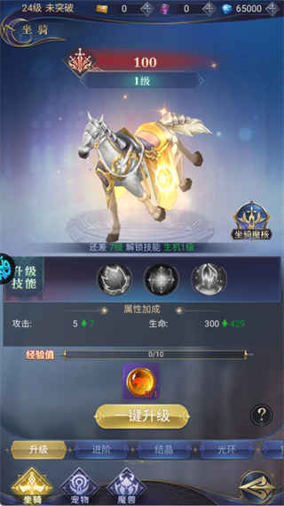 通过消耗坐骑经验道具并点击「一键升级」,快速提升坐骑等级,直接增强攻击、生命等核心属性;当坐骑达到8级时,将解锁「生机」技能,提供续航或输出增益,大幅提升实战表现。