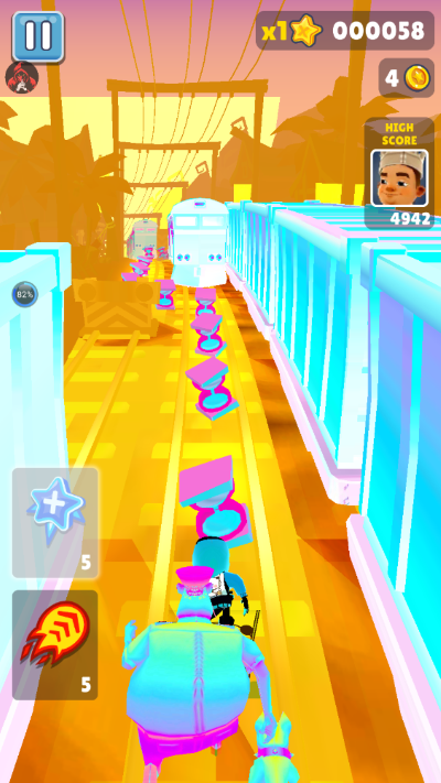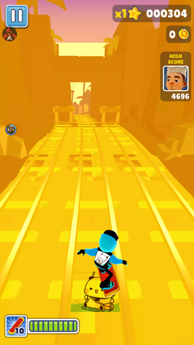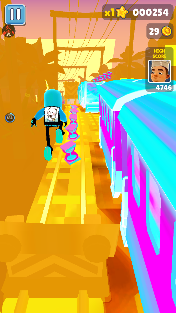 3、通过上下左右滑动屏幕控制角色移动:左/右滑切换轨道,上滑跳跃,下滑下蹲,灵活躲避障碍并拾取沙漏计时器以累积更高分数;