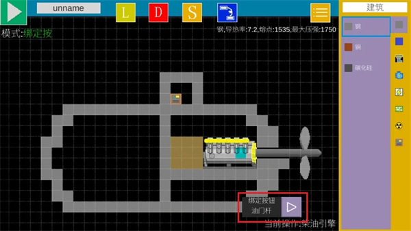 完成搭建后,点击上方蓝色“按键关联”按钮,再选择柴油引擎,即可为其绑定操作指令(如油门)。