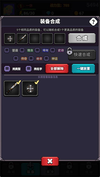 5件同品质装备可升阶;同类装备数量越多,合成时获得相同类型装备的概率越高。