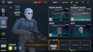 4. 角色深度强化:通过解锁面具、防弹背心与主题服装,塑造杀手小丑、特种兵或经典匪徒形象,配合高清3D画面与剧情演出,营造电影级枪战体验。