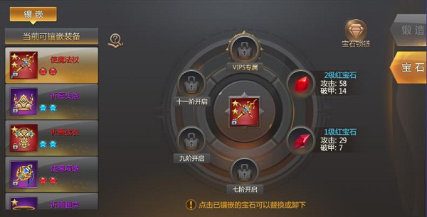 【宝石镶嵌】 游戏内含蓝宝石(提升攻击)与红宝石(提升防御)两类,每类共10级。装备最多可镶嵌6颗宝石,但同一属性不可重复。高阶装备替换时,低阶装备自动返还背包,已镶嵌宝石效果同步继承。
