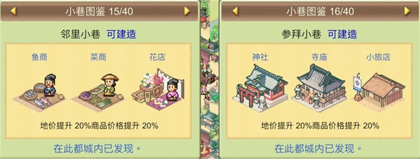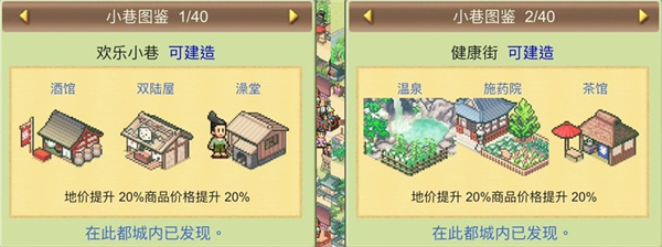 6、游戏内还提供“小巷图鉴”系统,玩家可在其中查看已解锁或未来可建造的各类建筑信息,方便统筹发展方向。