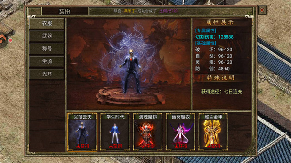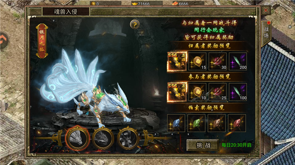 自服务器开启第二天起,每晚20:30将触发【上古魂兽】挑战事件。每位玩家仅可进入一张地图,建议行会提前协调分工。成功击杀魂兽后,怪物归属者及其所在地图的本行会成员可获得归属奖励,其余行会玩家则领取参与奖励。