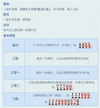 跑得快为三人各自为战模式,无抢地主环节。使用48张牌(去除大小王、三张2及一张A),每人发16张。率先出完手中牌者获胜,游戏立即结束。