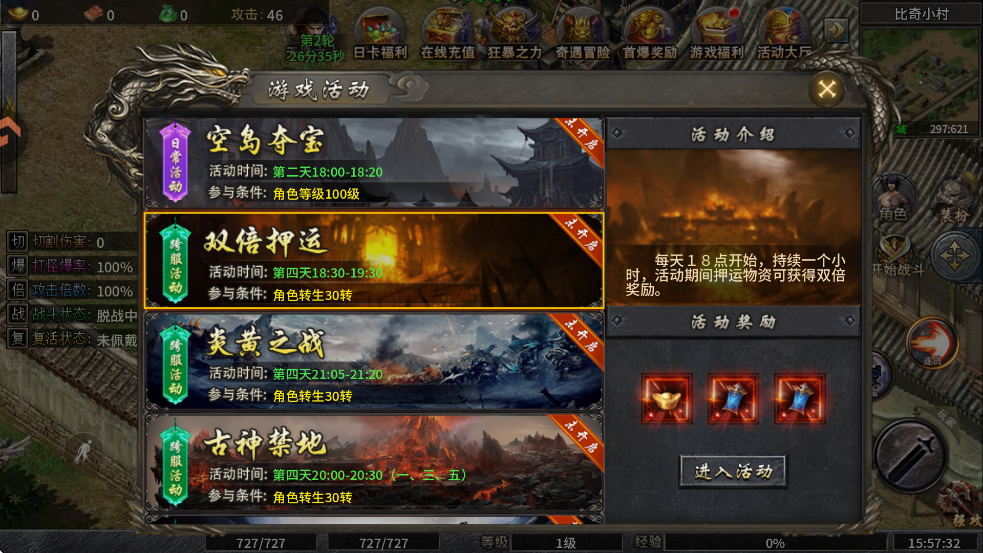 每日18点开启,持续1小时,活动期间押运物资可获得双倍奖励。