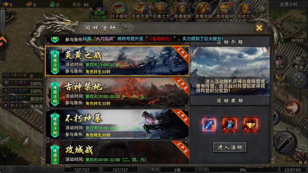 进入活动后随机分配至炎帝或黄帝阵营,击杀敌对阵营玩家可获得阵营积分奖励。