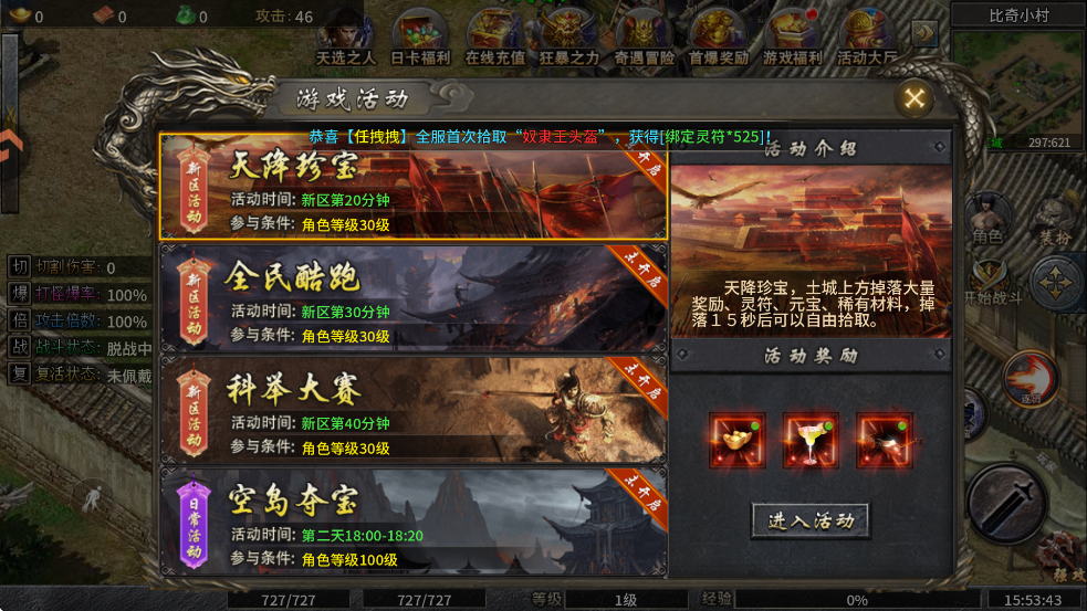 土城上方定时掉落大量奖励,包括灵符、元宝及稀有材料,15秒后开放自由拾取。